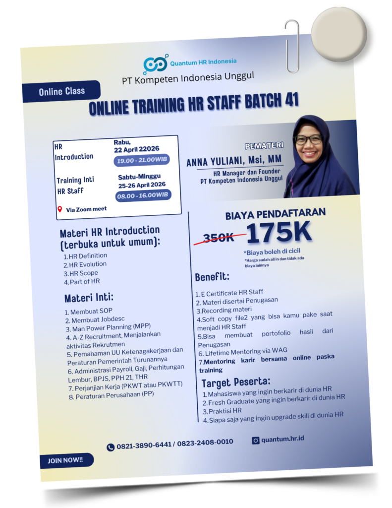 Quantum HR Indonesia adalah program training HR berbasis praktik & pendampingan karier, dirancang untuk fresh graduate, job seeker, dan career switcher yang ingin tembus posisi HR meski tanpa background Psikologi atau Hukum.